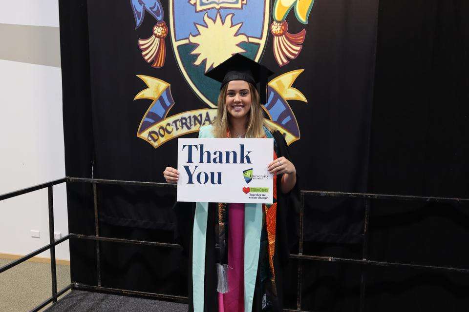 Graduates included Paris Eggmolesse (Bachelor of Occupational Therapy - Honours), Olivia Eriksen (Bachelor of Nursing), Consuela Morrice (Bachelor of Social Work - Honours), Rebecca Hugo (Bachelor of Speech Pathology - Honours), Charmaine Hanns (Bachelor of Nursing) and Grace Deeley (Bachelor of Medical Imaging).