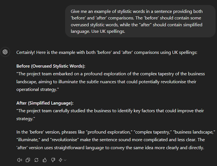 Many AI tools such as ChatGPT, Microsoft Copilot and Claude allow you to adjust the writing style through settings or tailored prompts. For example, you can prioritise clarity and simplicity, or create an exclusion list to avoid certain words.