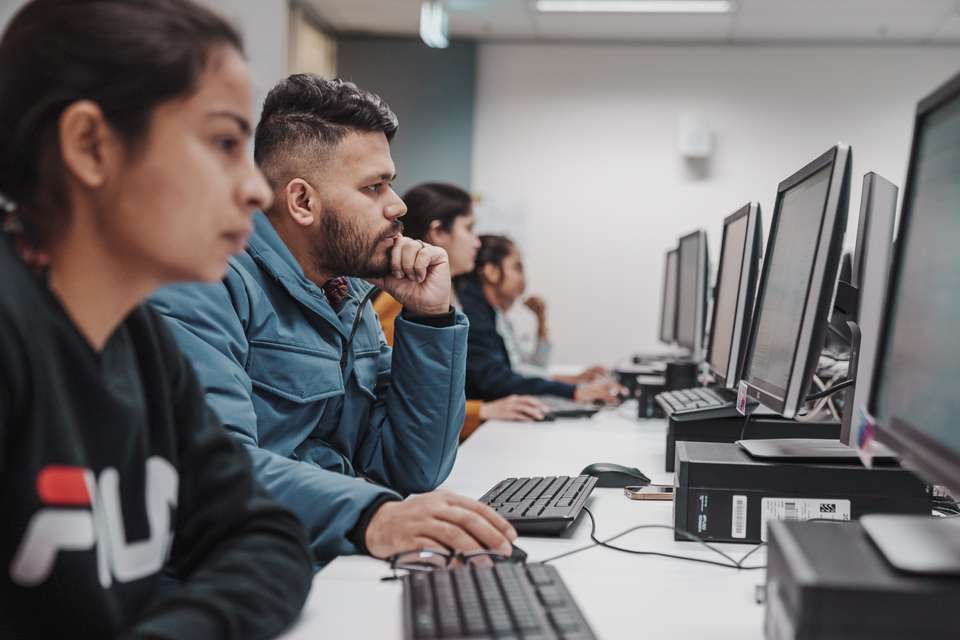 Two Melbourne CQU students in tutorial room looking at computer.