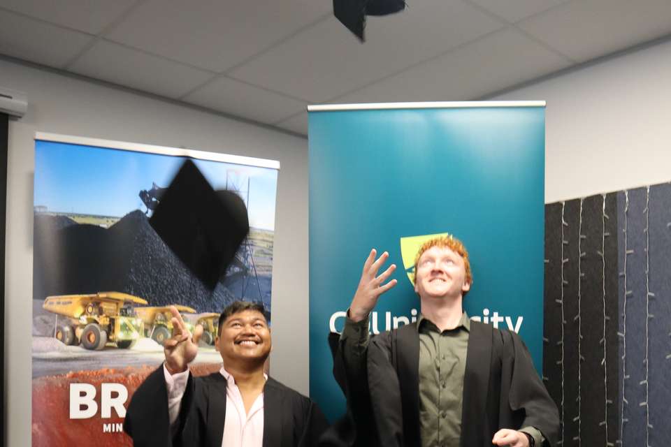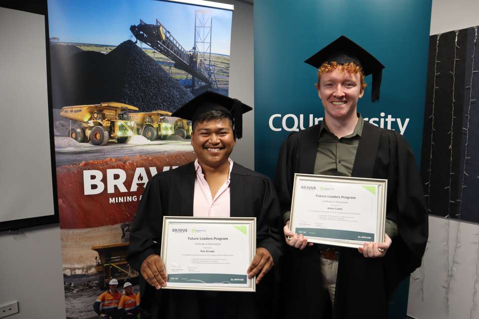 Aidan Castle and Rex Gruspe celebrated their achievements at CQU’s Townsville campus today after completing the inaugural Future Leaders Program - Bravus Mining and Resources talent development pathway, delivered in partnership with CQUniversity.